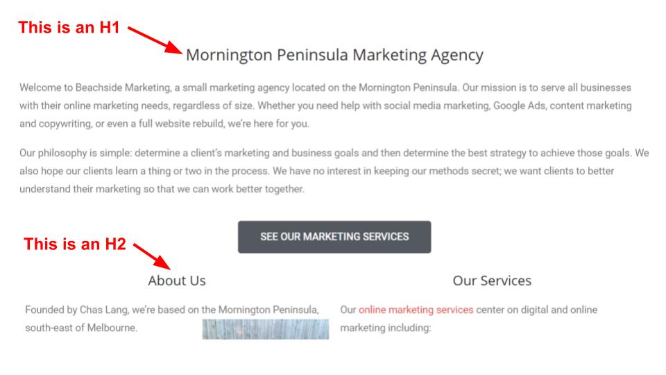 So here is HTML headings. An element that isn’t as important as it once was, but one of the many minor signals that search engines use to make a decision about ranking your site.